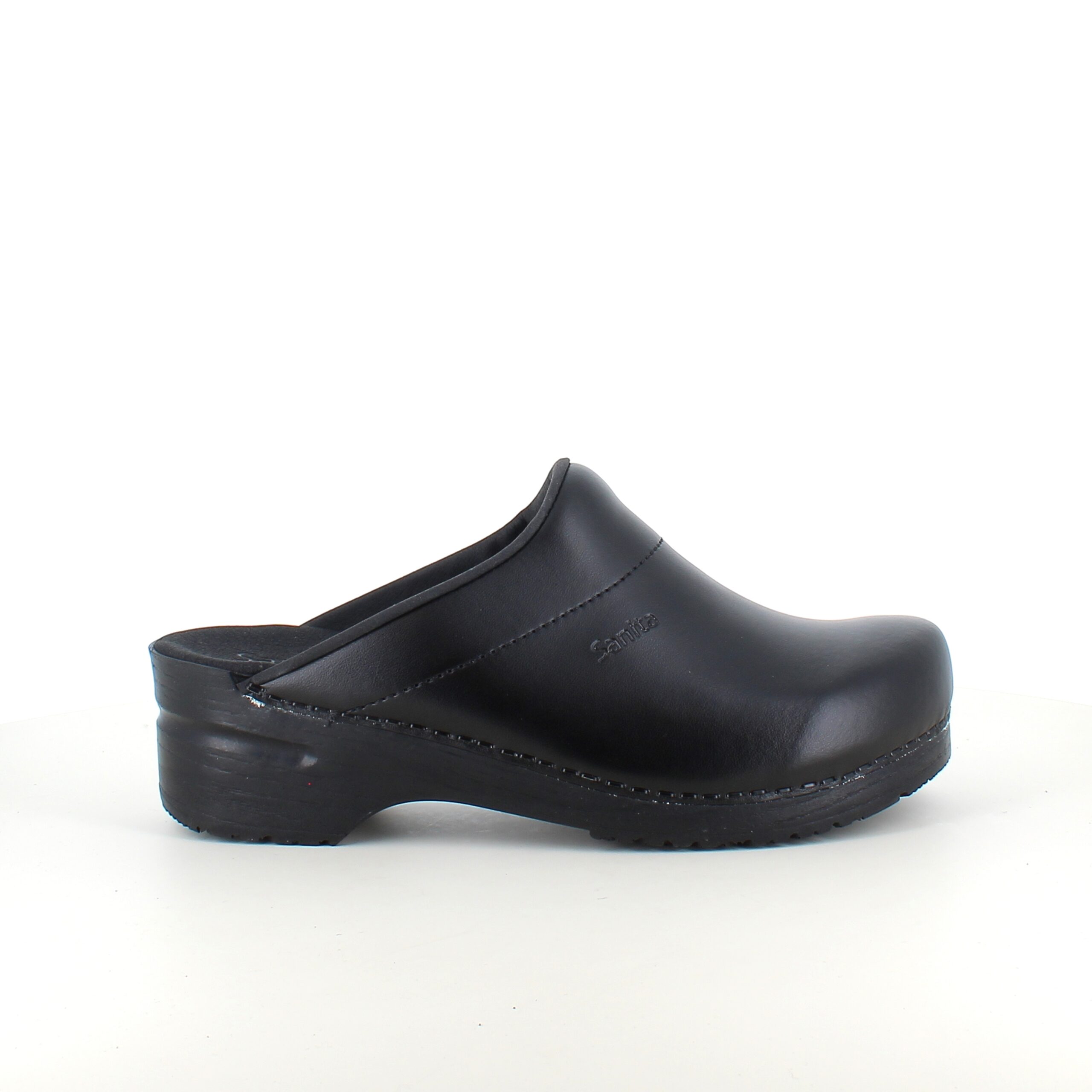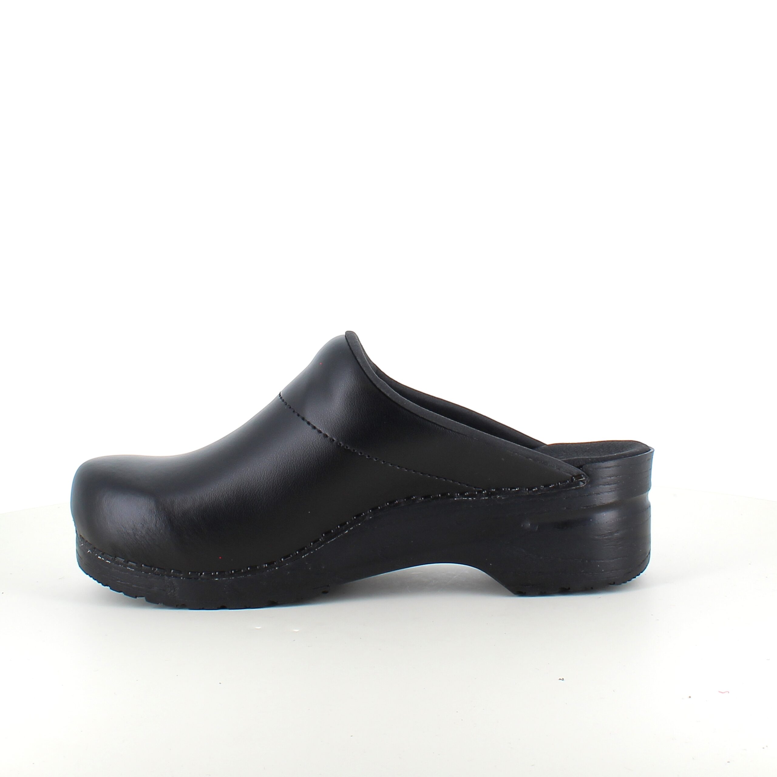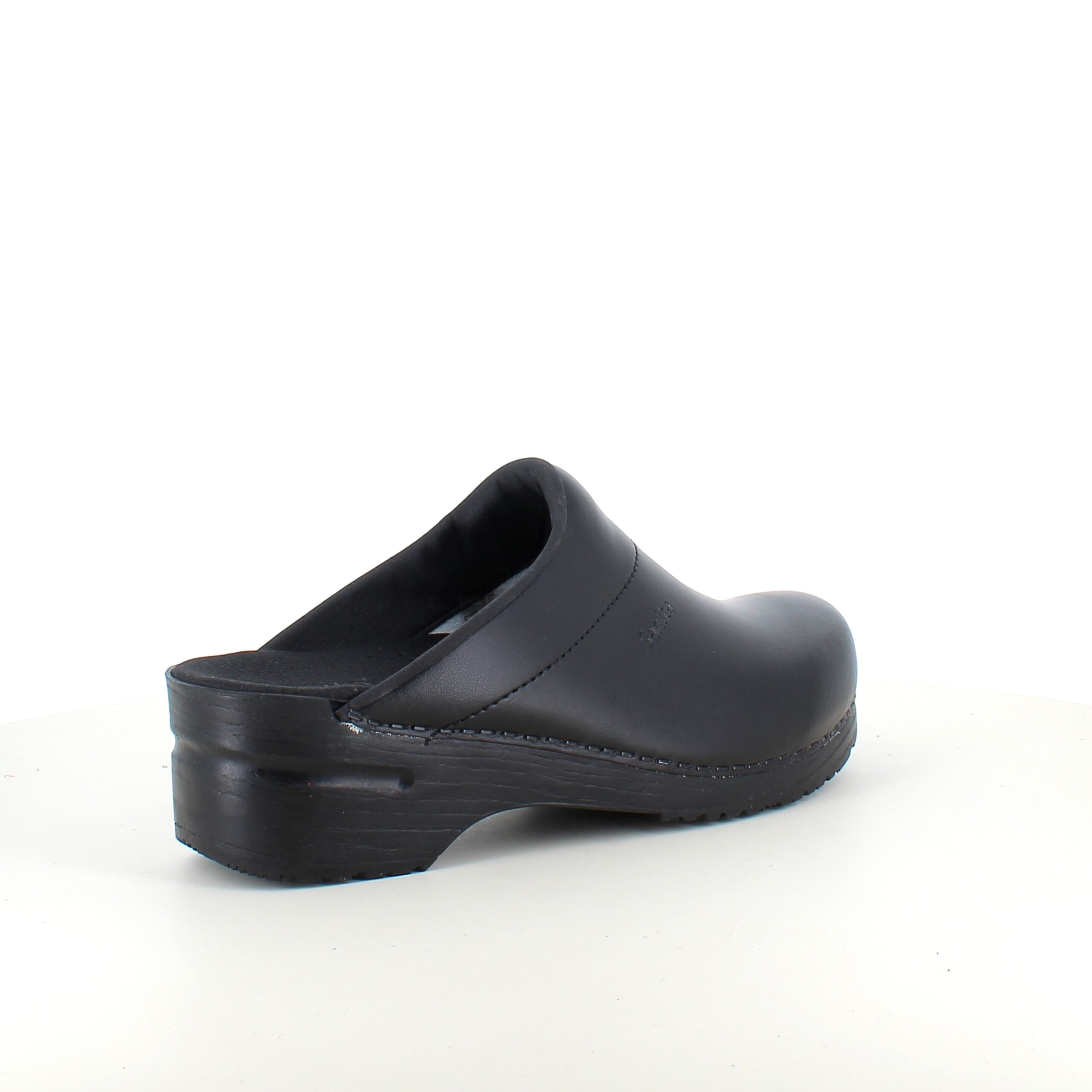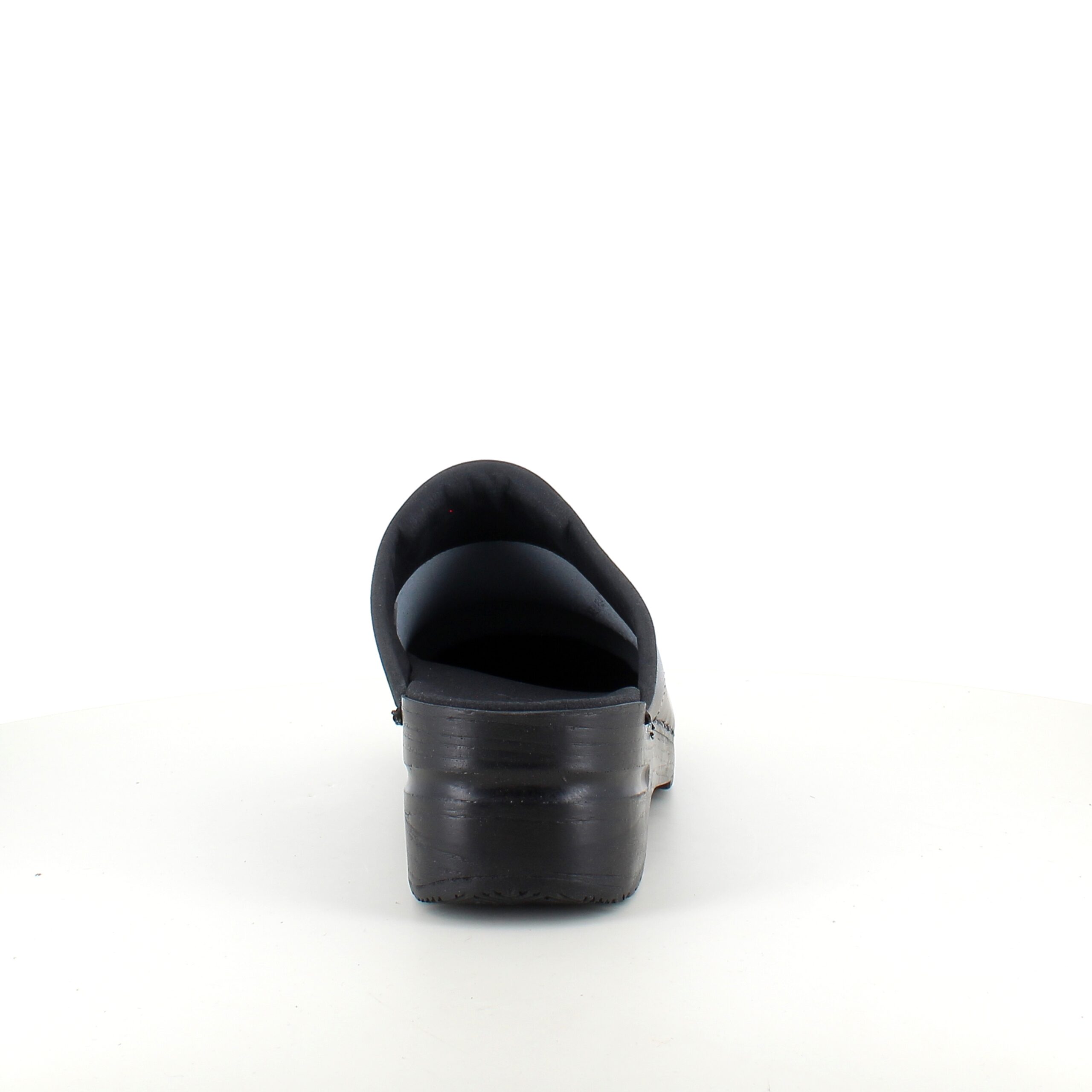 Denna träsko är tillverkad i svart slät läder, vilket är lätt att rengöra och mycket slitstarkt.