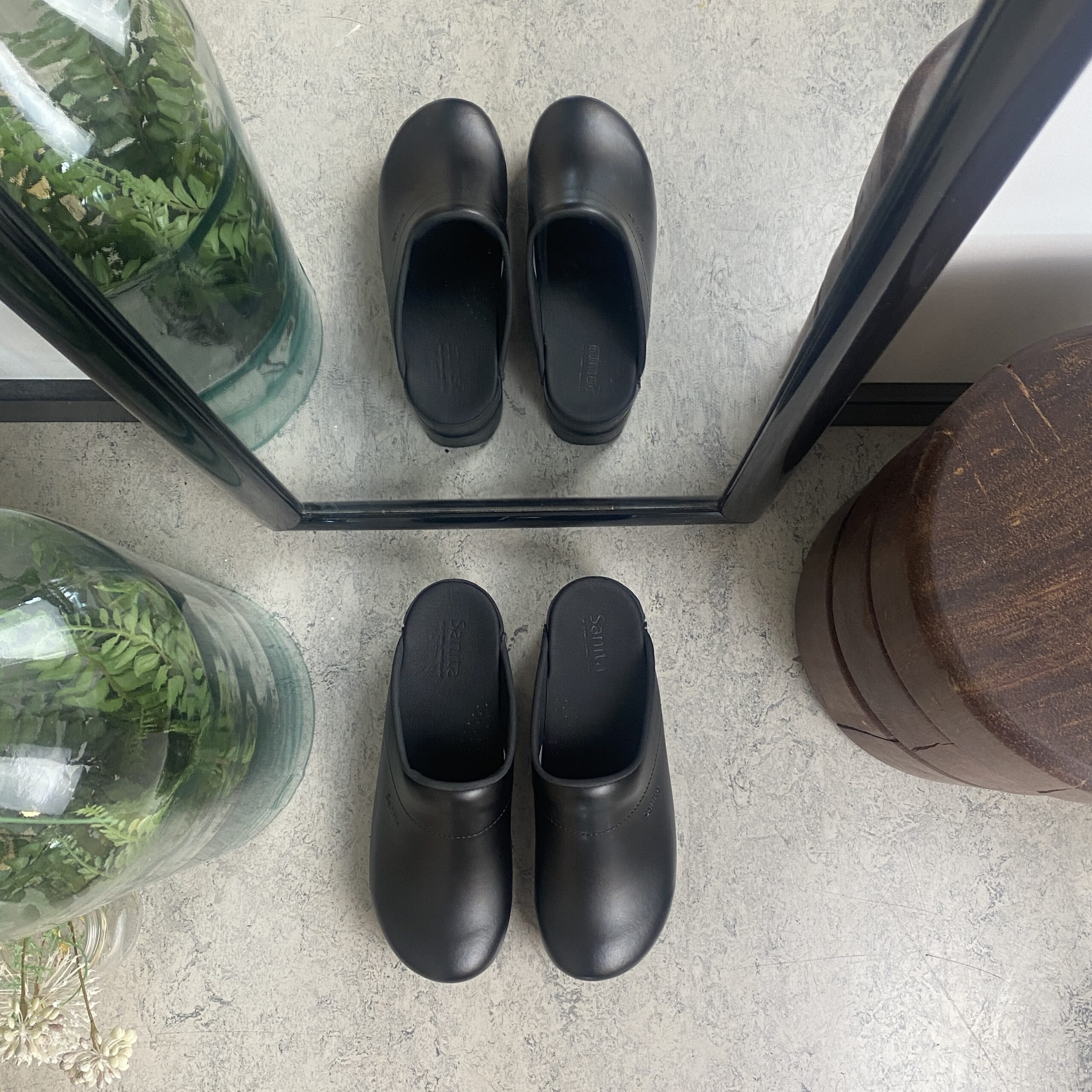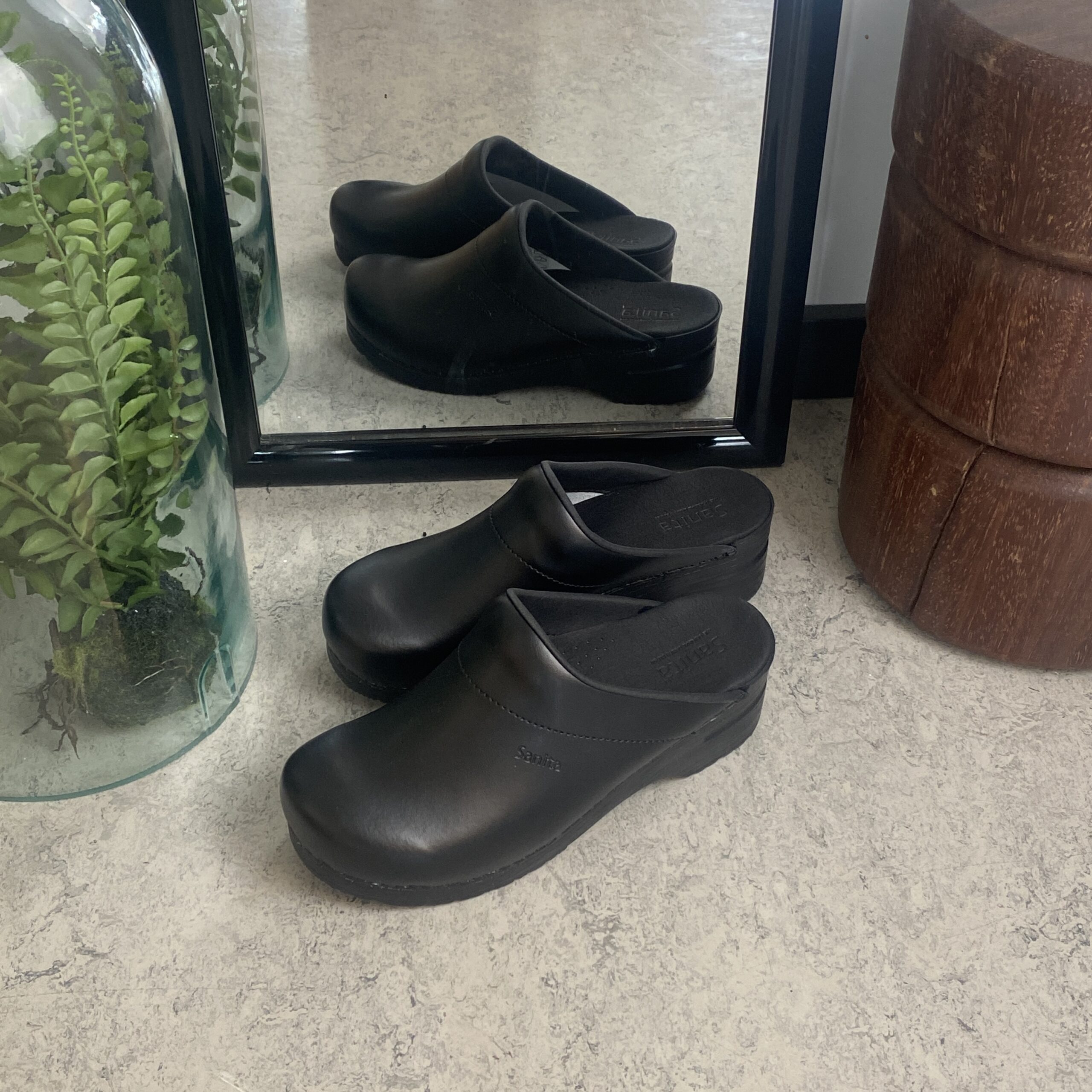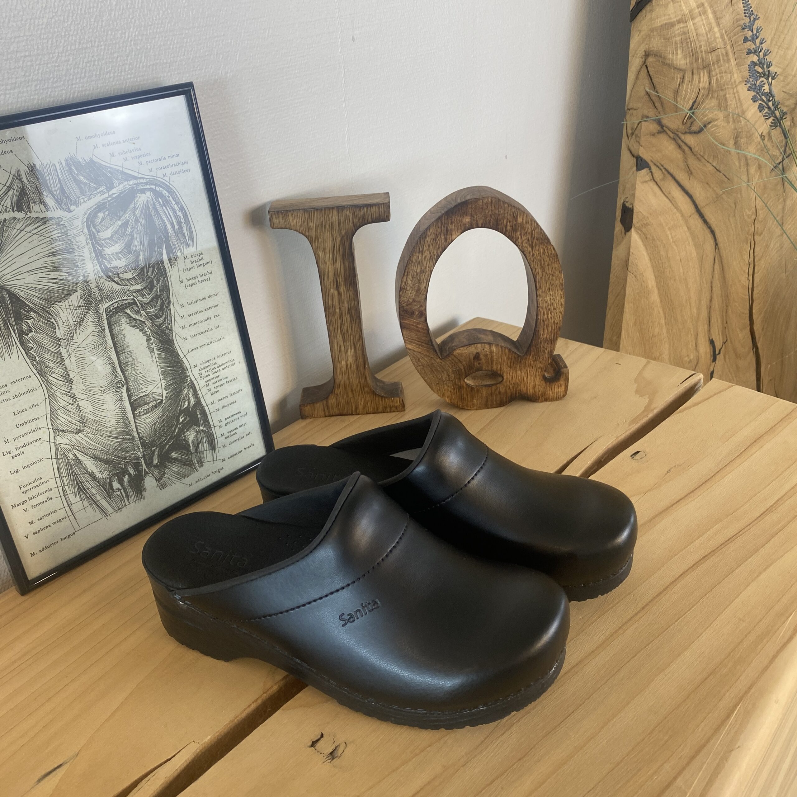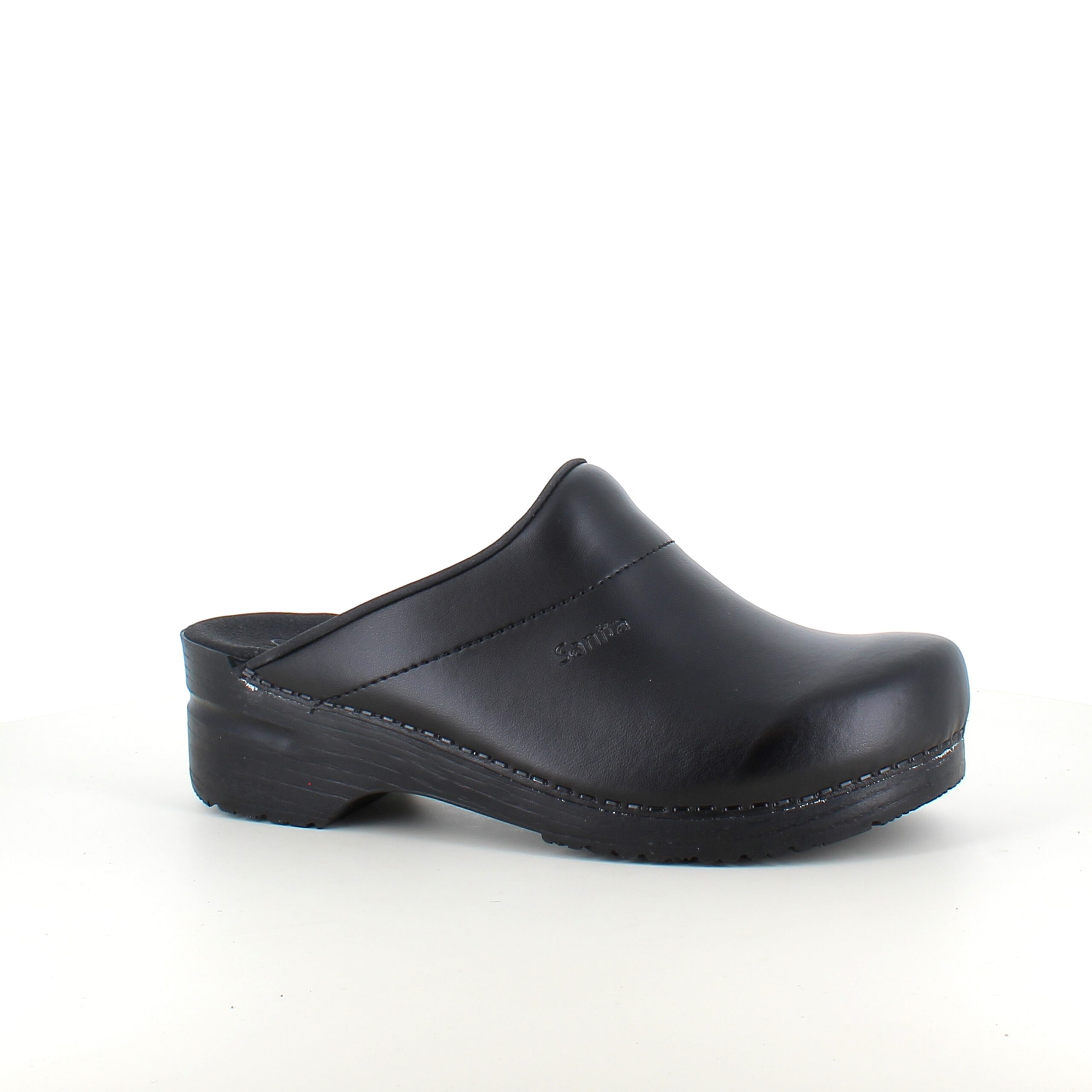 Denna träsko är tillverkad i svart slät läder, vilket är lätt att rengöra och mycket slitstarkt.