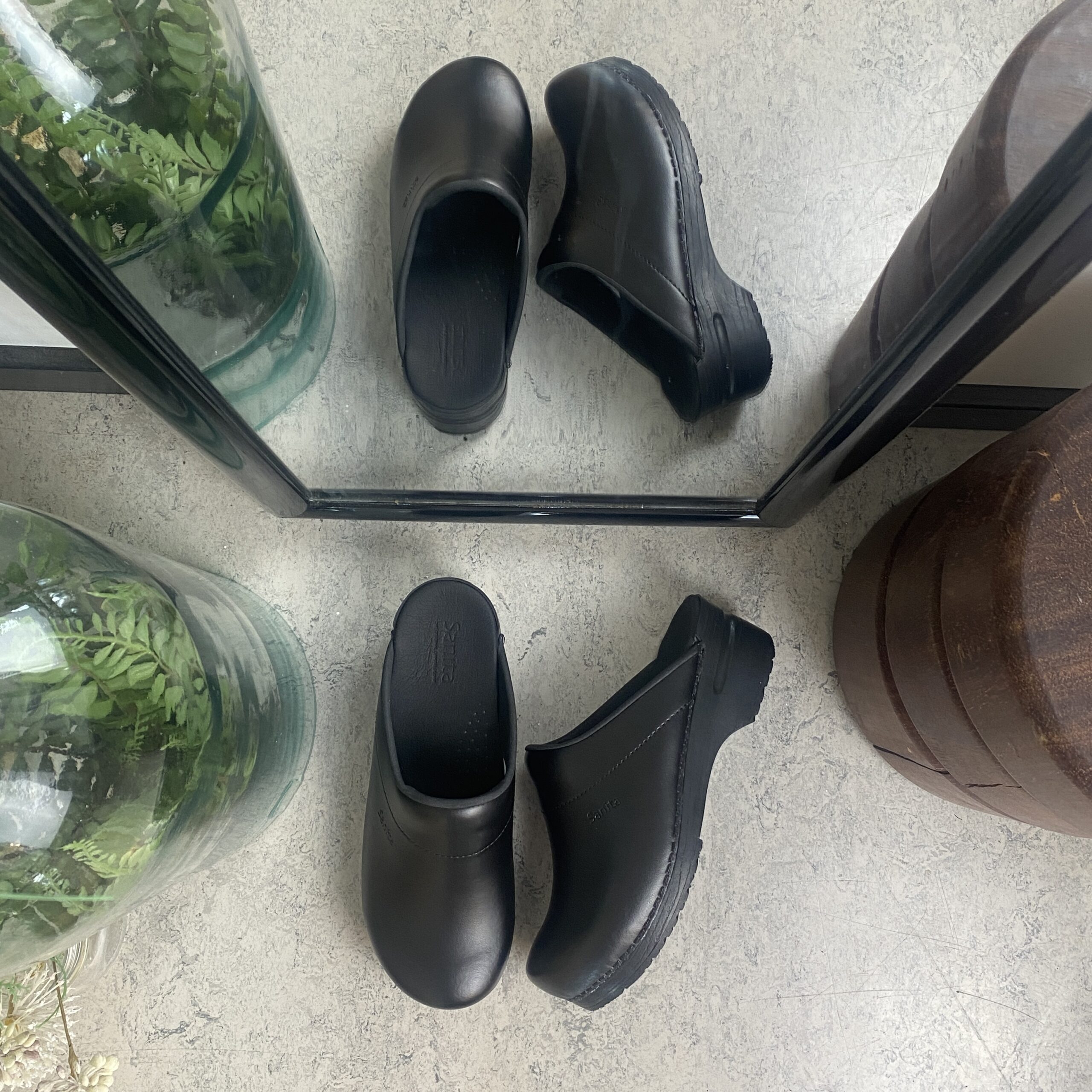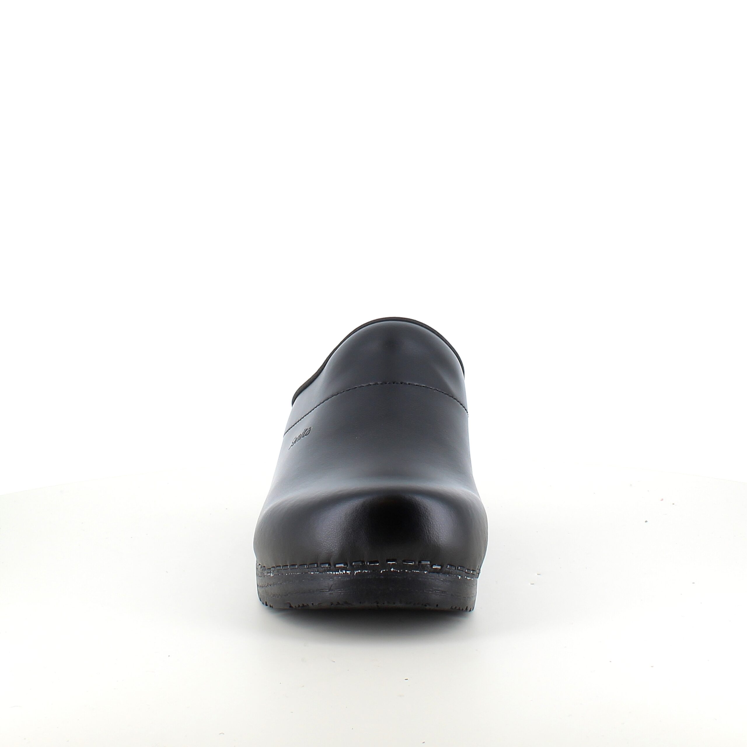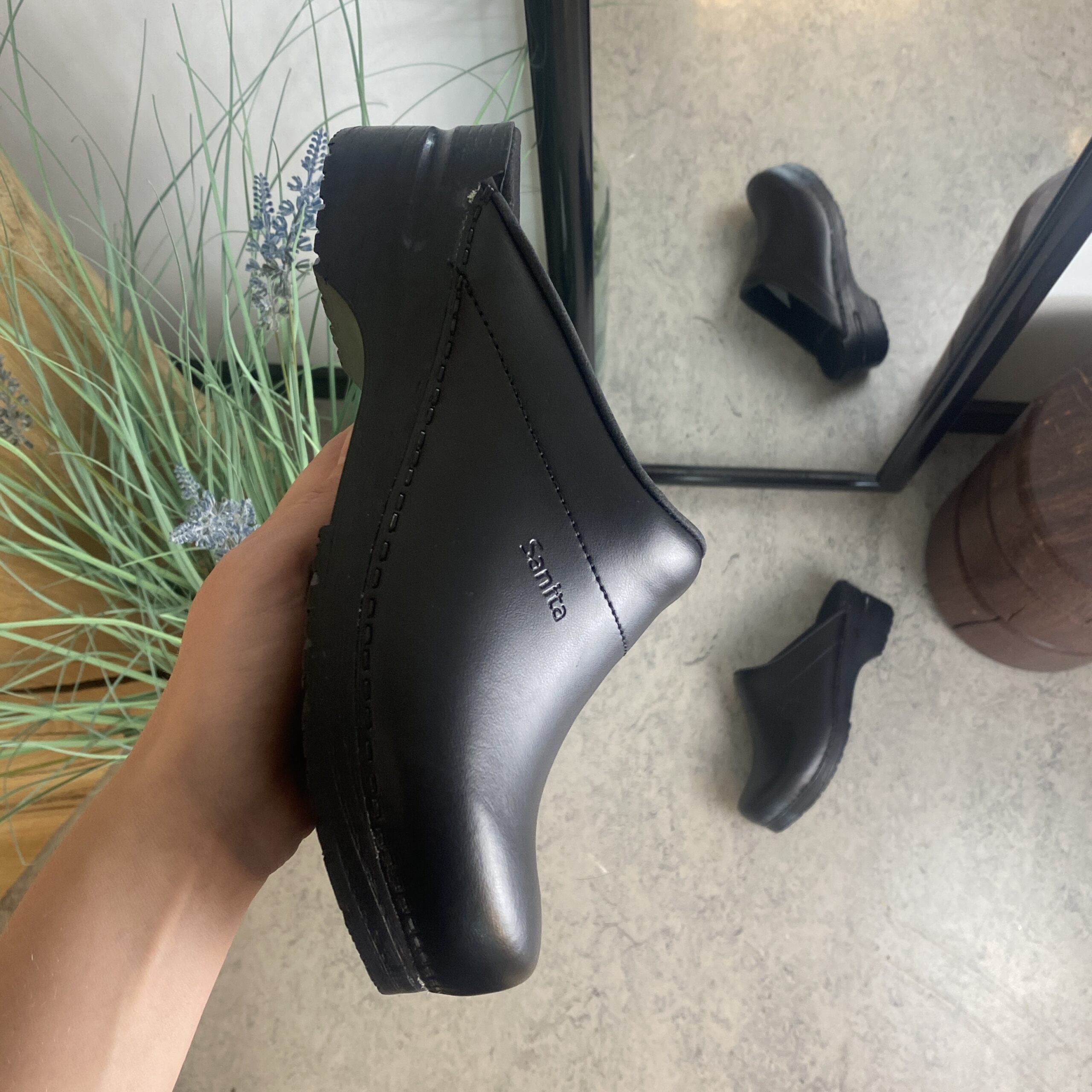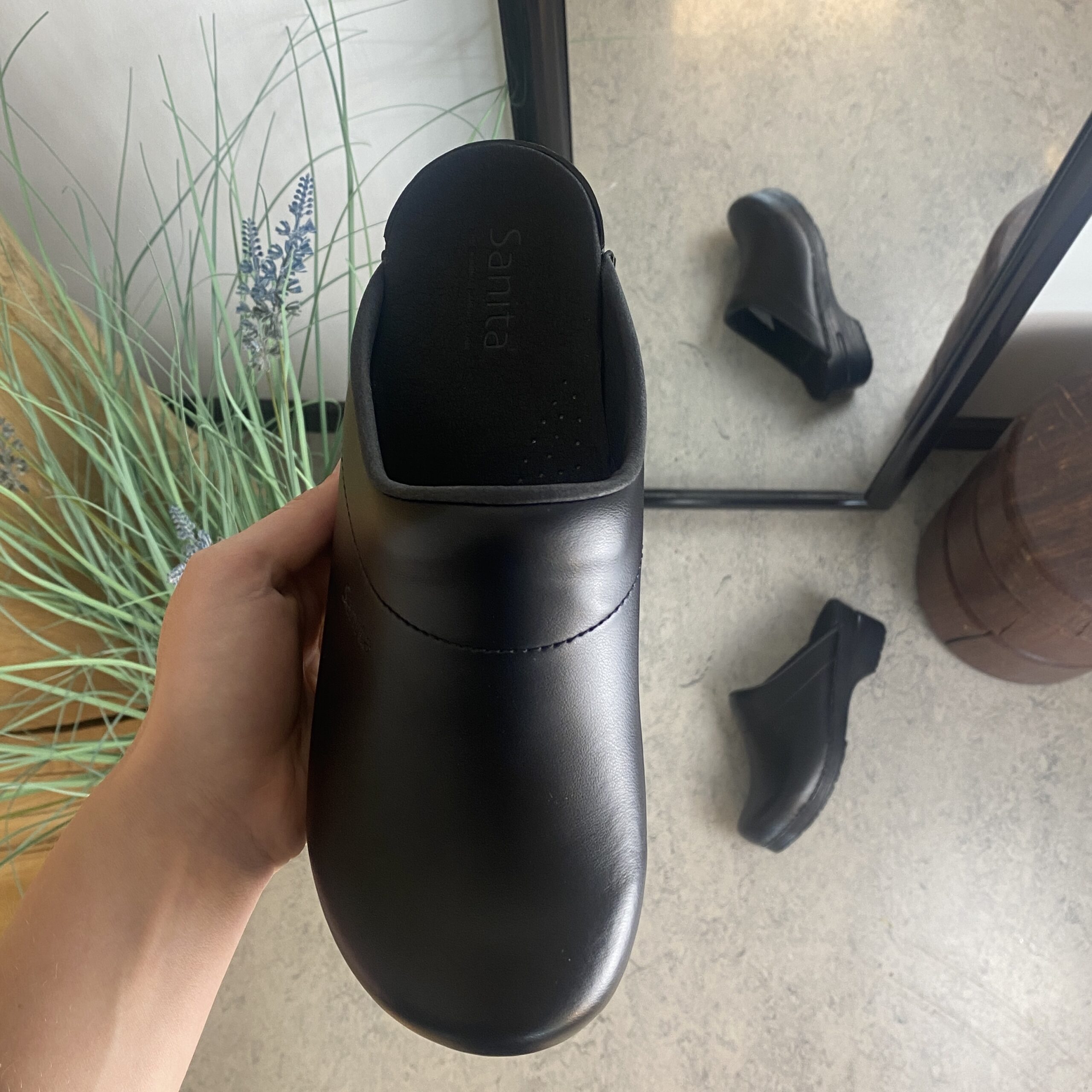 Denna träsko är tillverkad i svart slät läder, vilket är lätt att rengöra och mycket slitstarkt.