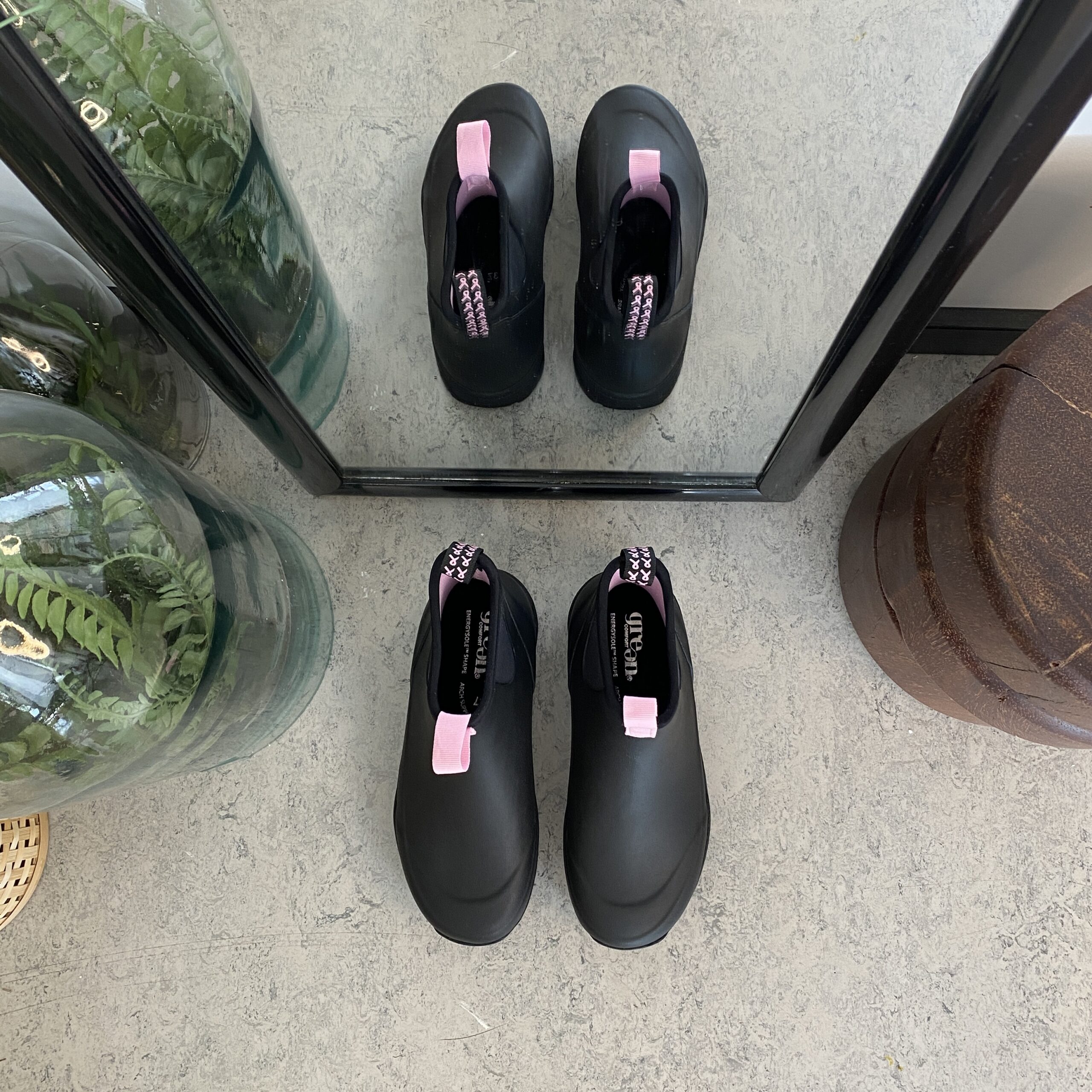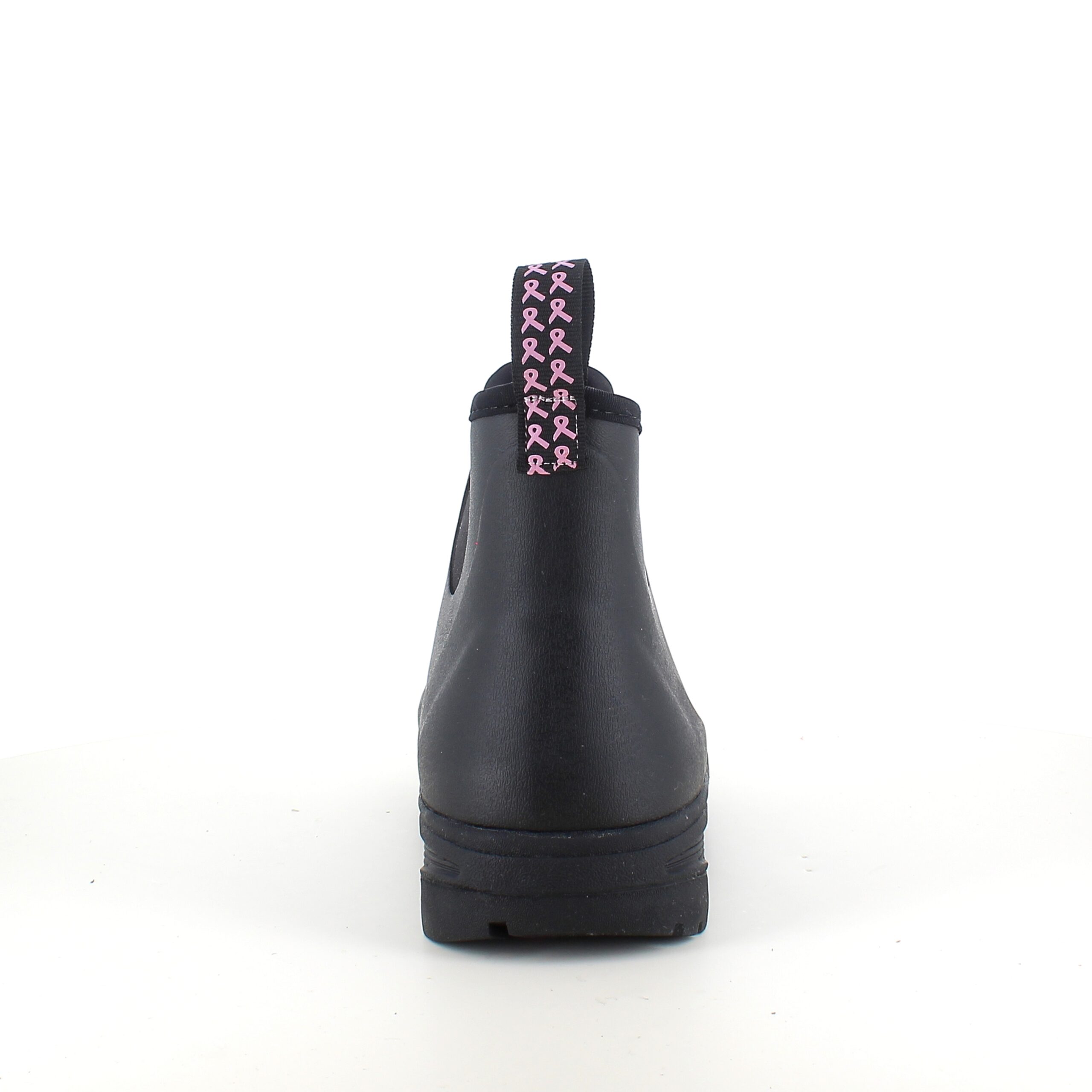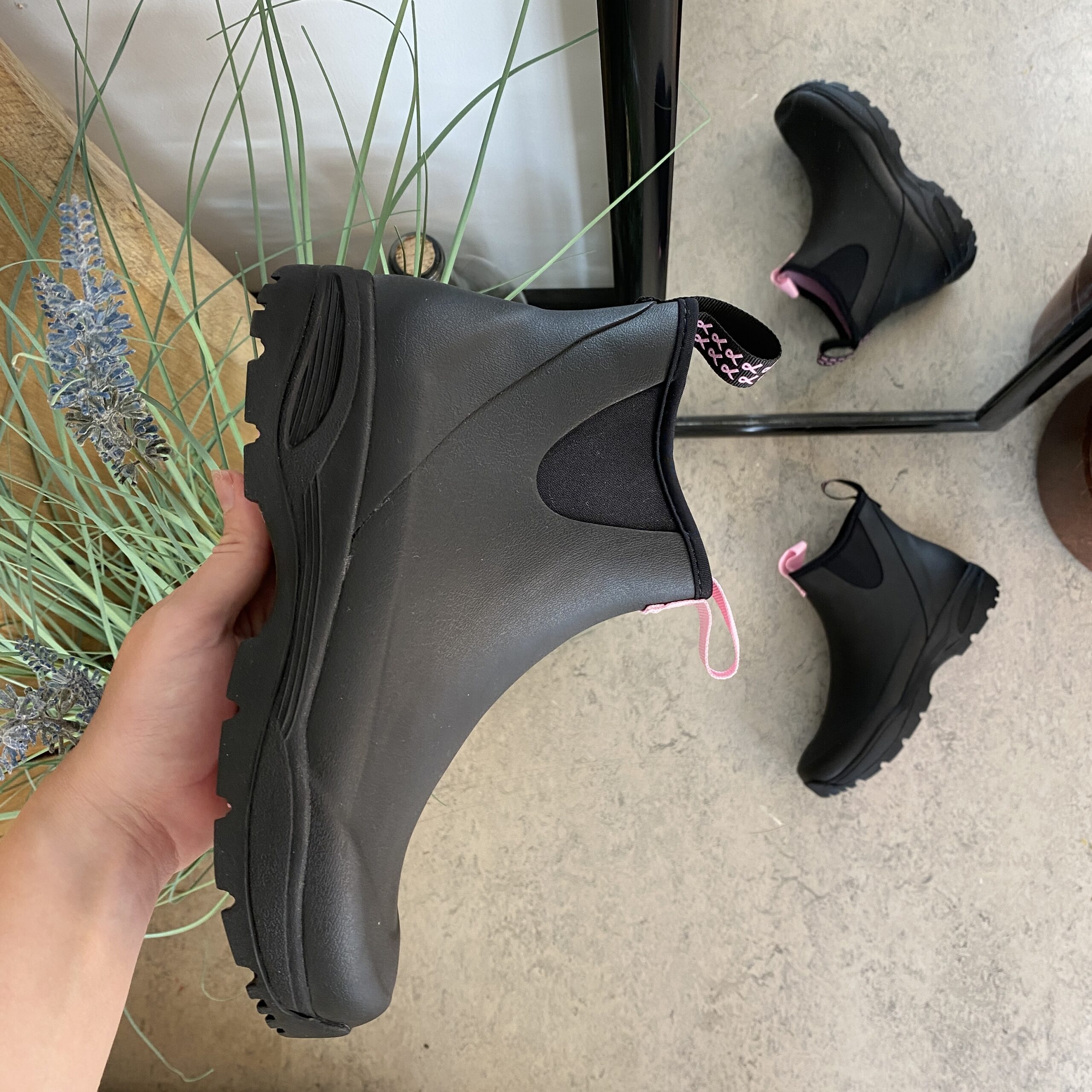 Upptäck våra svarta gummistövlar, skapade med omtanke och i samarbete med Rosa Bandet, där den igenkännliga rosa färgen elegant framhävs i botten av stöveln samt i den dekorativa rosett som pryder en av stropparna.