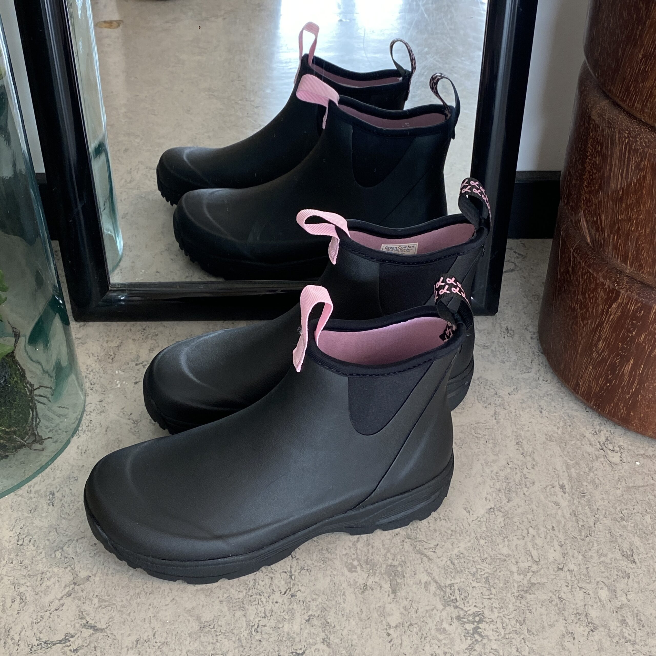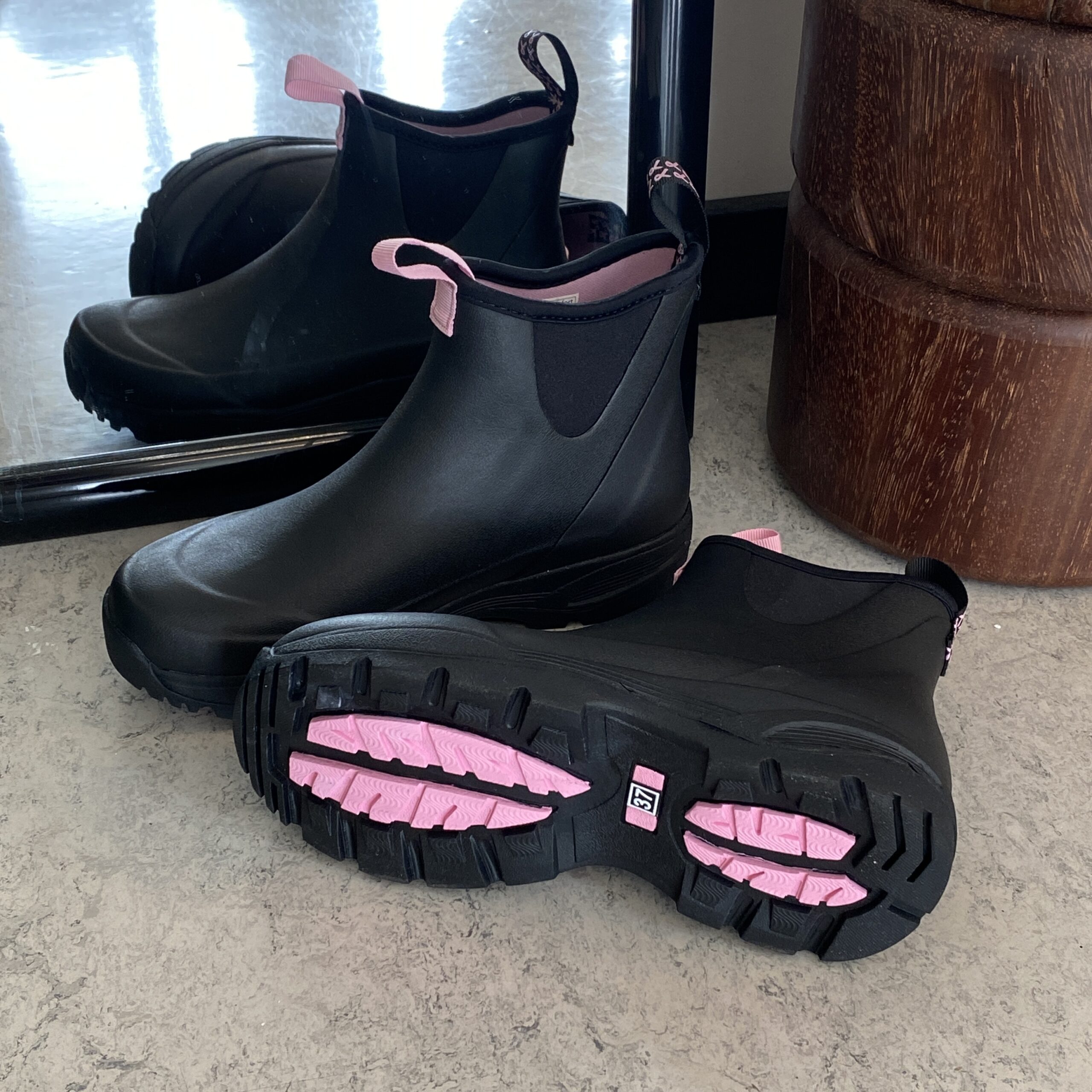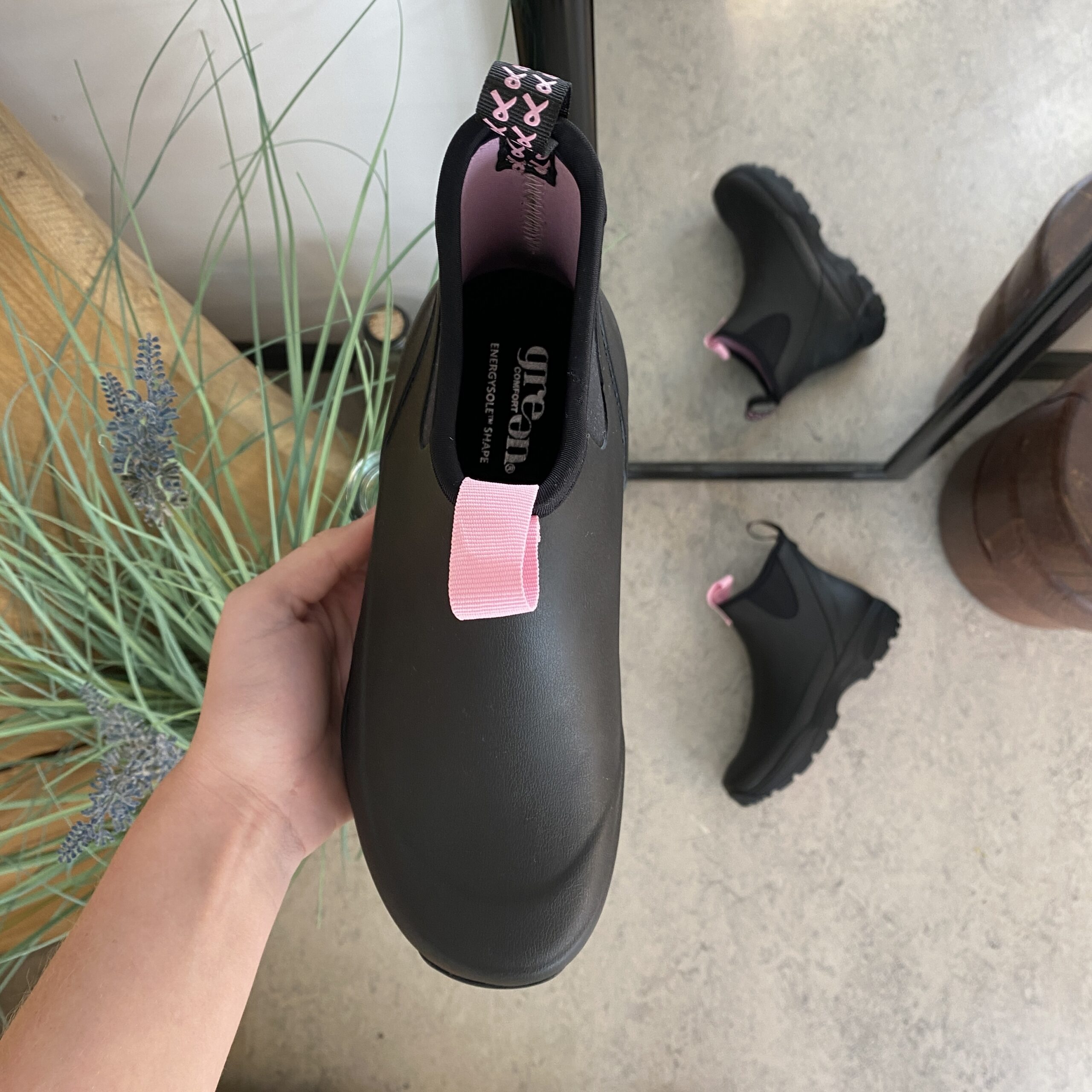 Upptäck våra svarta gummistövlar, skapade med omtanke och i samarbete med Rosa Bandet, där den igenkännliga rosa färgen elegant framhävs i botten av stöveln samt i den dekorativa rosett som pryder en av stropparna.