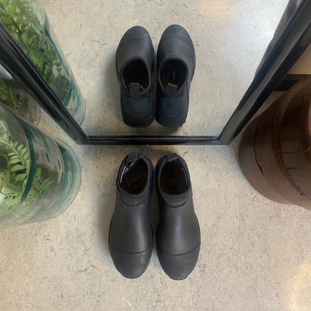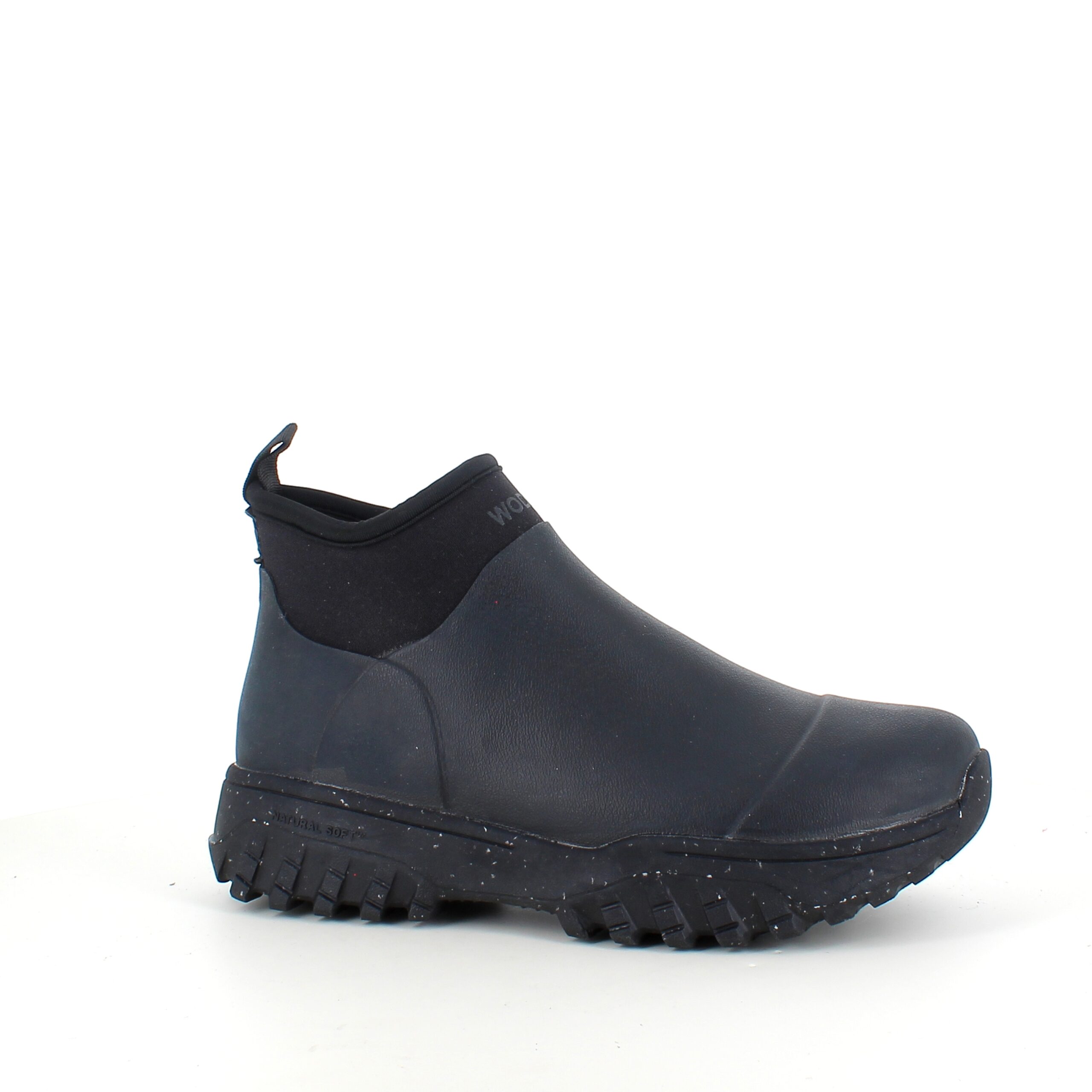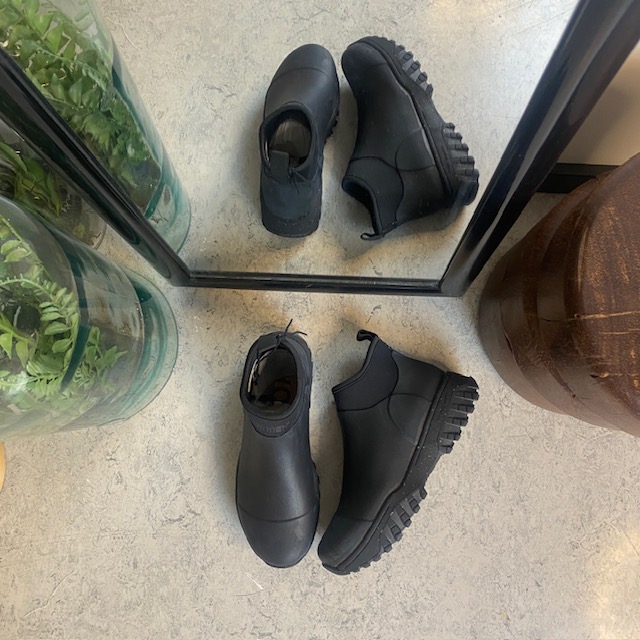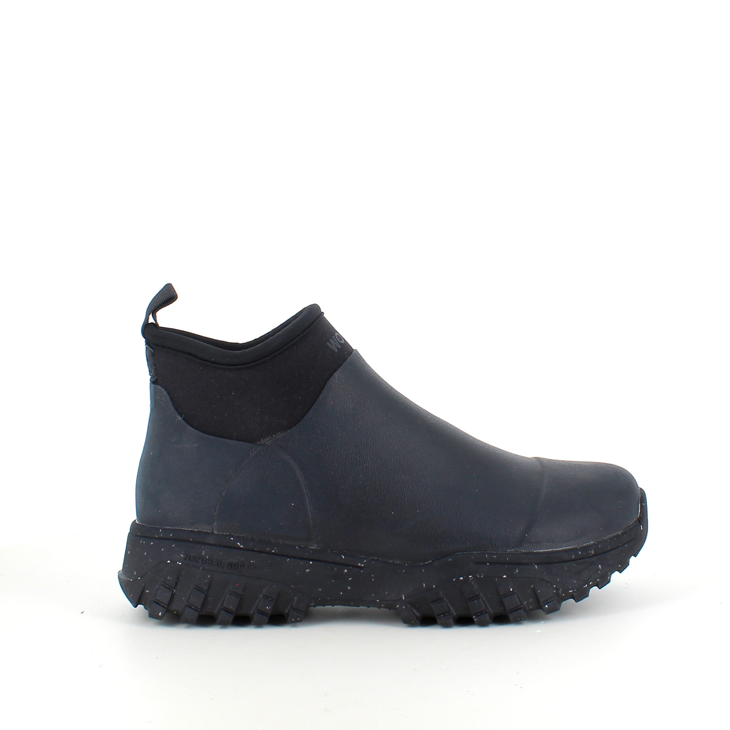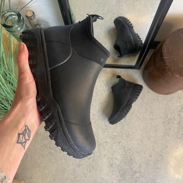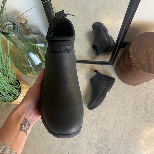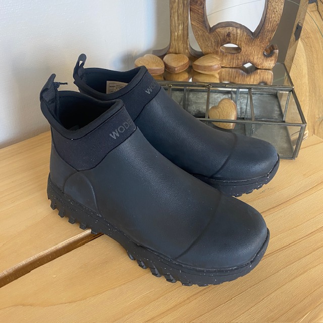 Kort svart gummistövel från Woden med hålfotsstöd och bra stötdämpning.