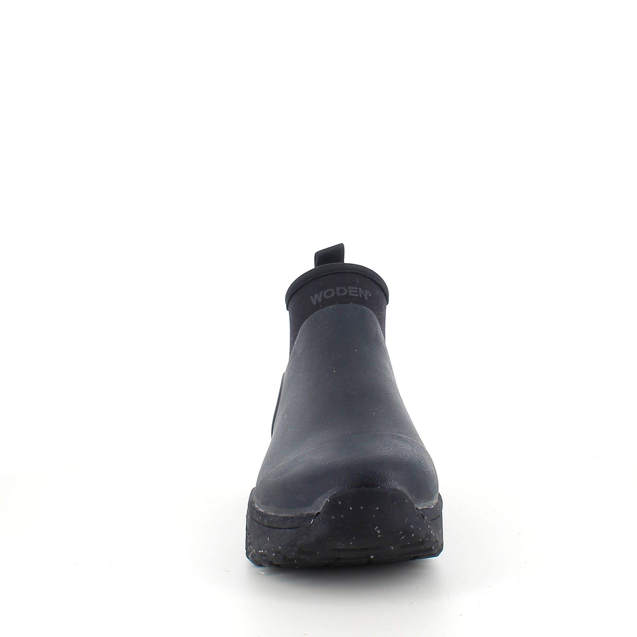 Kort svart gummistövel från Woden, som har en lätt passform med hög komfort, designad för en aktiv och modern livsstil.