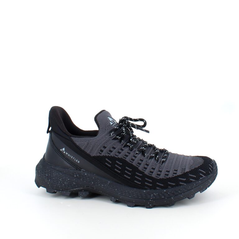 Dessa slip-on skor från Whistler har en andningsbar, stickad ovandel i grått och svart.