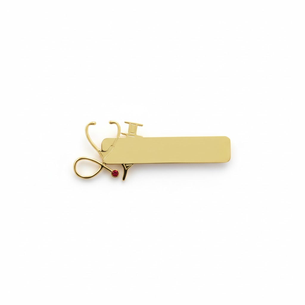 Den här vackra namnskylten i silverfärgat rostfritt stål är designad med ett elegant spraymotiv och en liten röd sten som detalj, som symboliserar precision och omsorg i hälsoarbetet. Skylten har ett modernt och stilrent uttryck, vilket gör den perfekt för sjuksköterskor, undersköterskor, biomedicinska analytiker och annan vårdpersonal som önskar en personlig prägel på sin uniform.