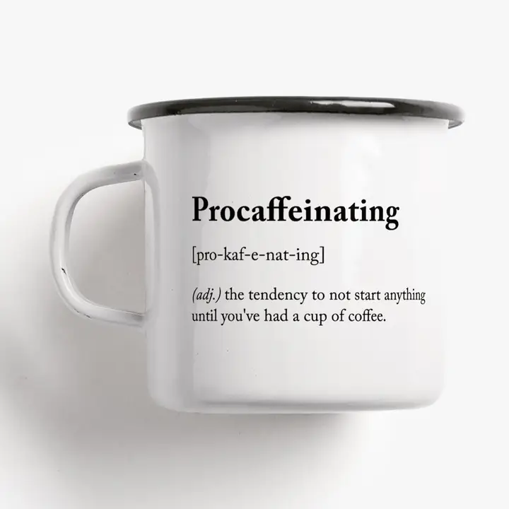 Denna vita emaljmugg är dekorerad med ordleken Procaffeinating, som definieras som tendensen att inte starta något förrän man fått sitt kaffe. Ett självklart val för dig som inte kan komma igång med dagen utan den första koppen – och som gärna vill tillföra ett leende till morgonstunden.