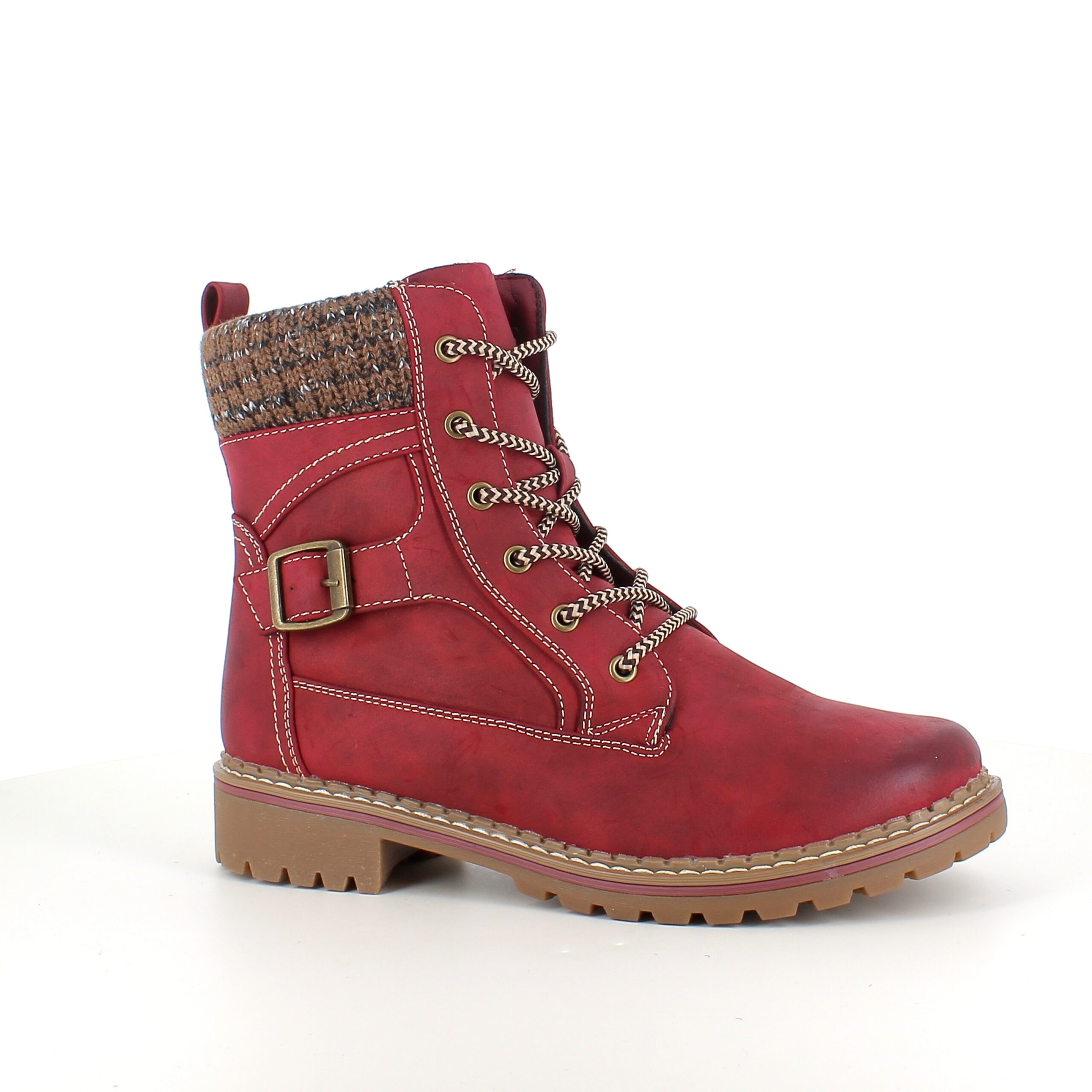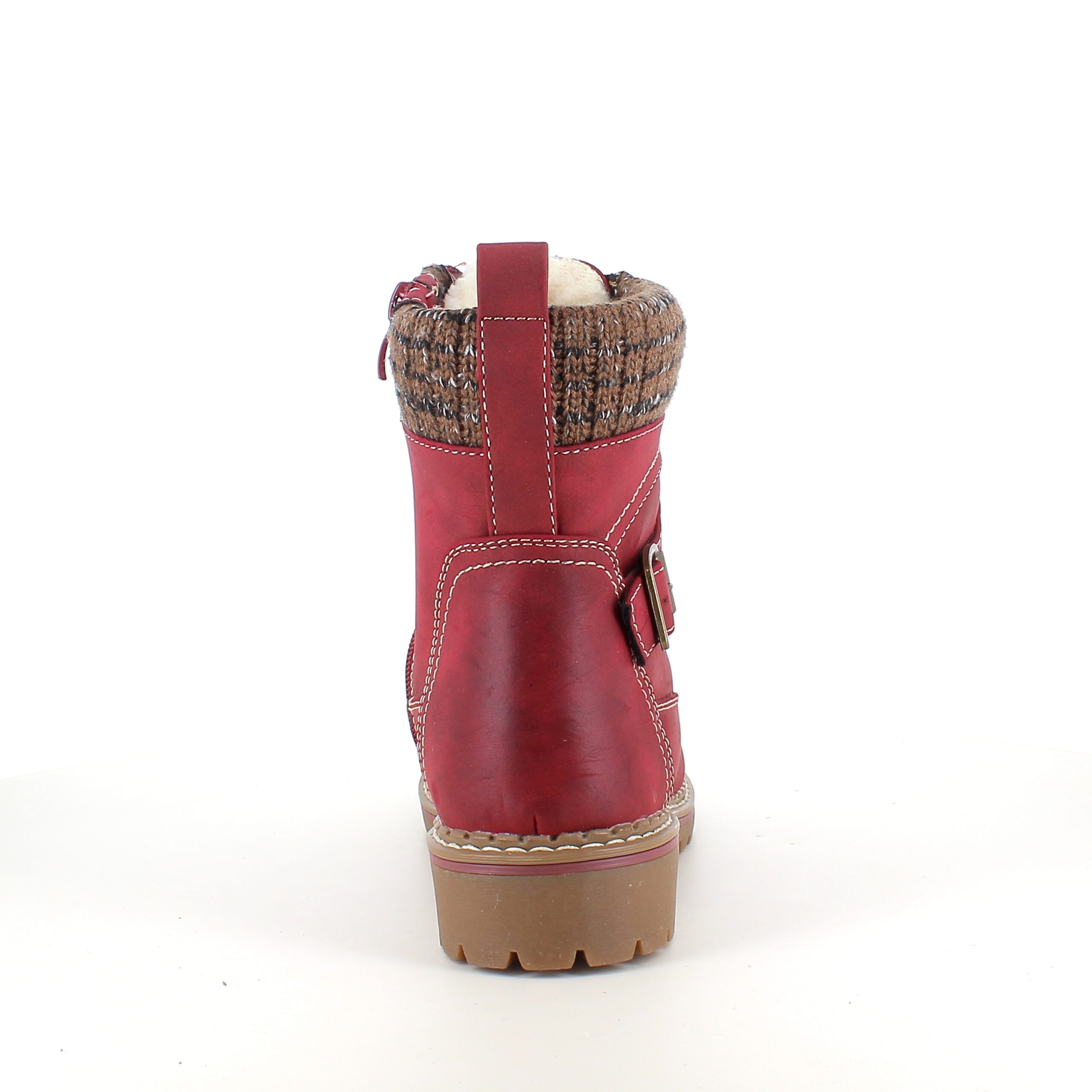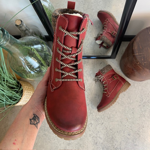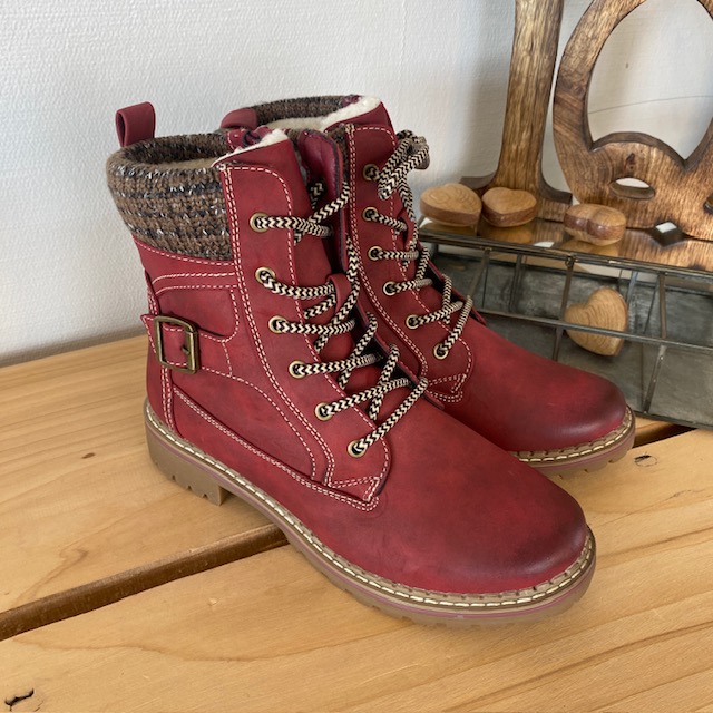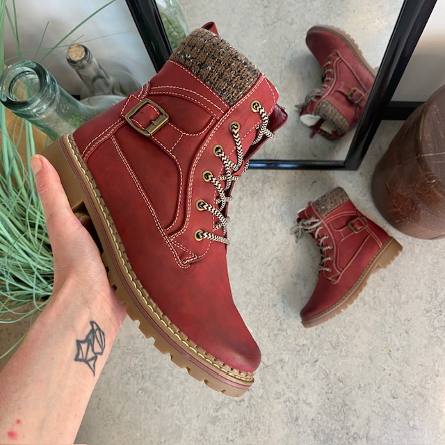Röd damstövel med snörning, dragkedja och varmt foder – dekorativt spänne och TPR-sula