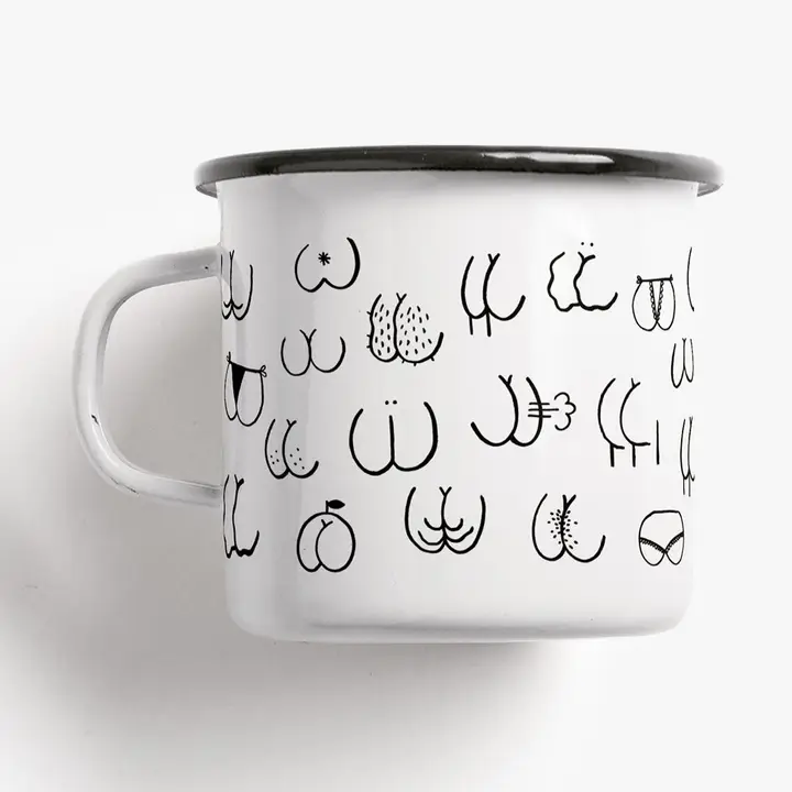 Denna vita emaljmugg pryds av en unik och humoristisk design, där roliga illustrationer av olika rumpor ger ett lekfullt och annorlunda uttryck. Den klassiska emaljytan gör muggen både slitstark och lätt att rengöra, medan den svarta kanten tillför en retro-look som passar perfekt både i köket, på picknicken eller på kontoret.