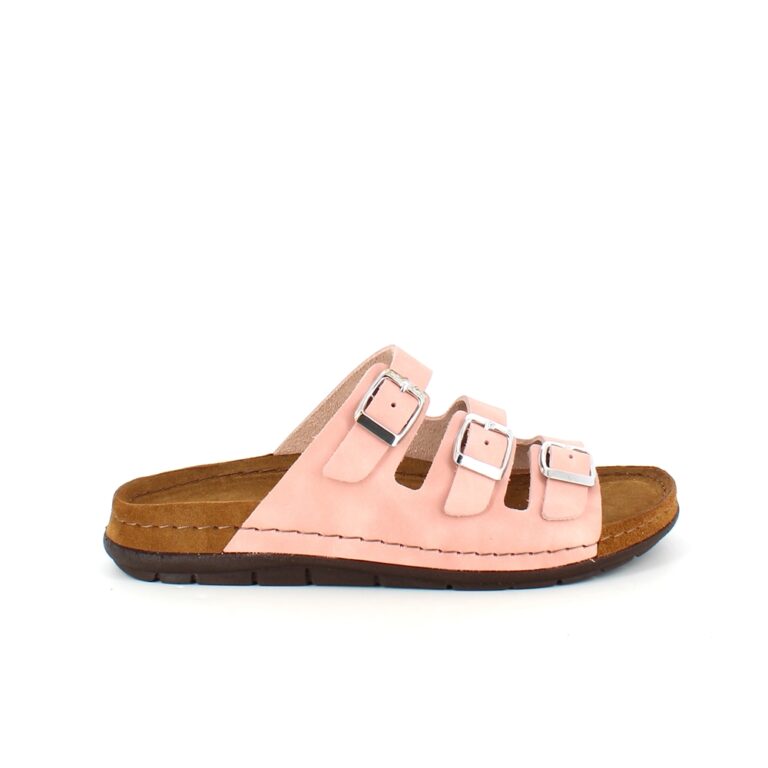 Läcker rosa slip-on sandal i skinn med tre smala, justerbara remmar.