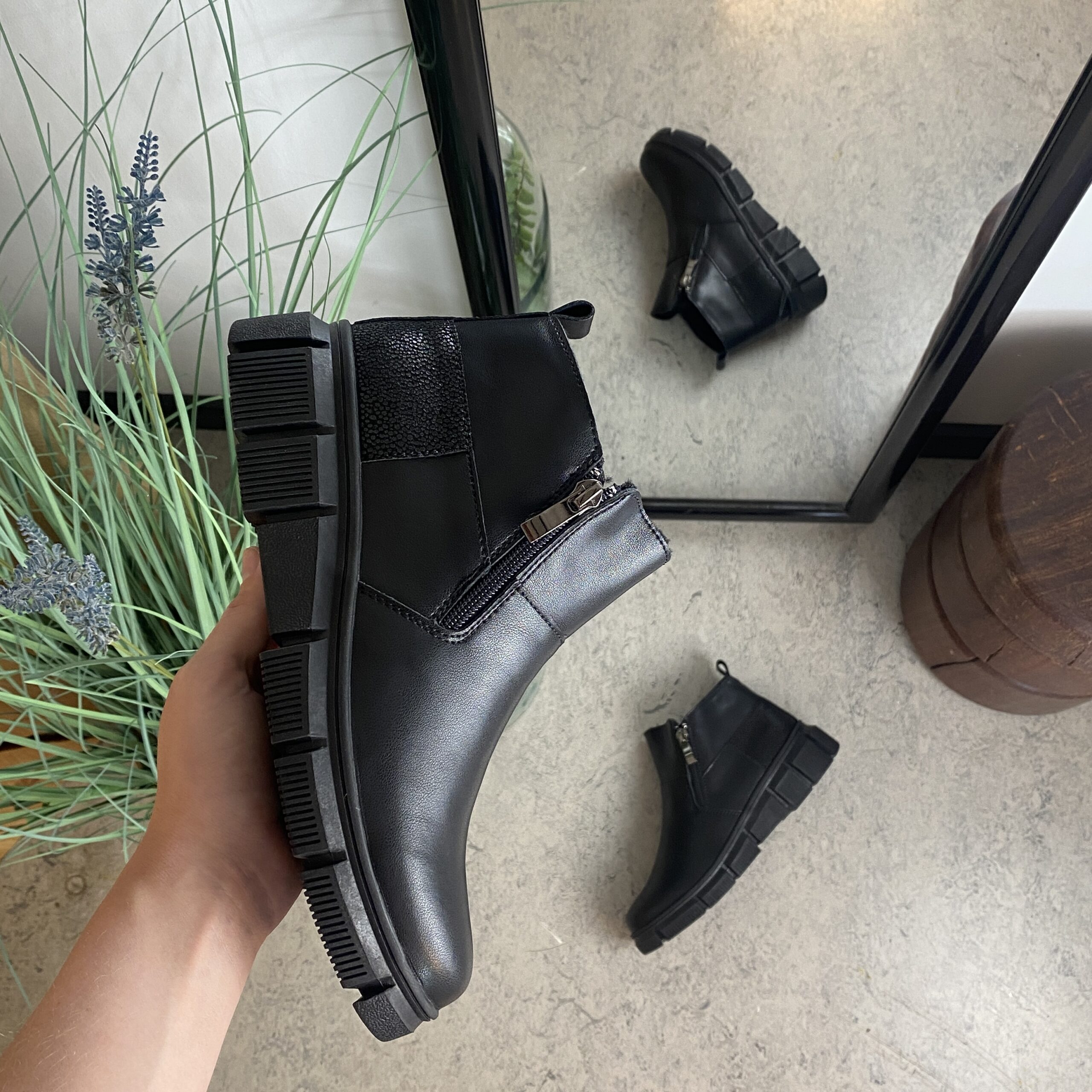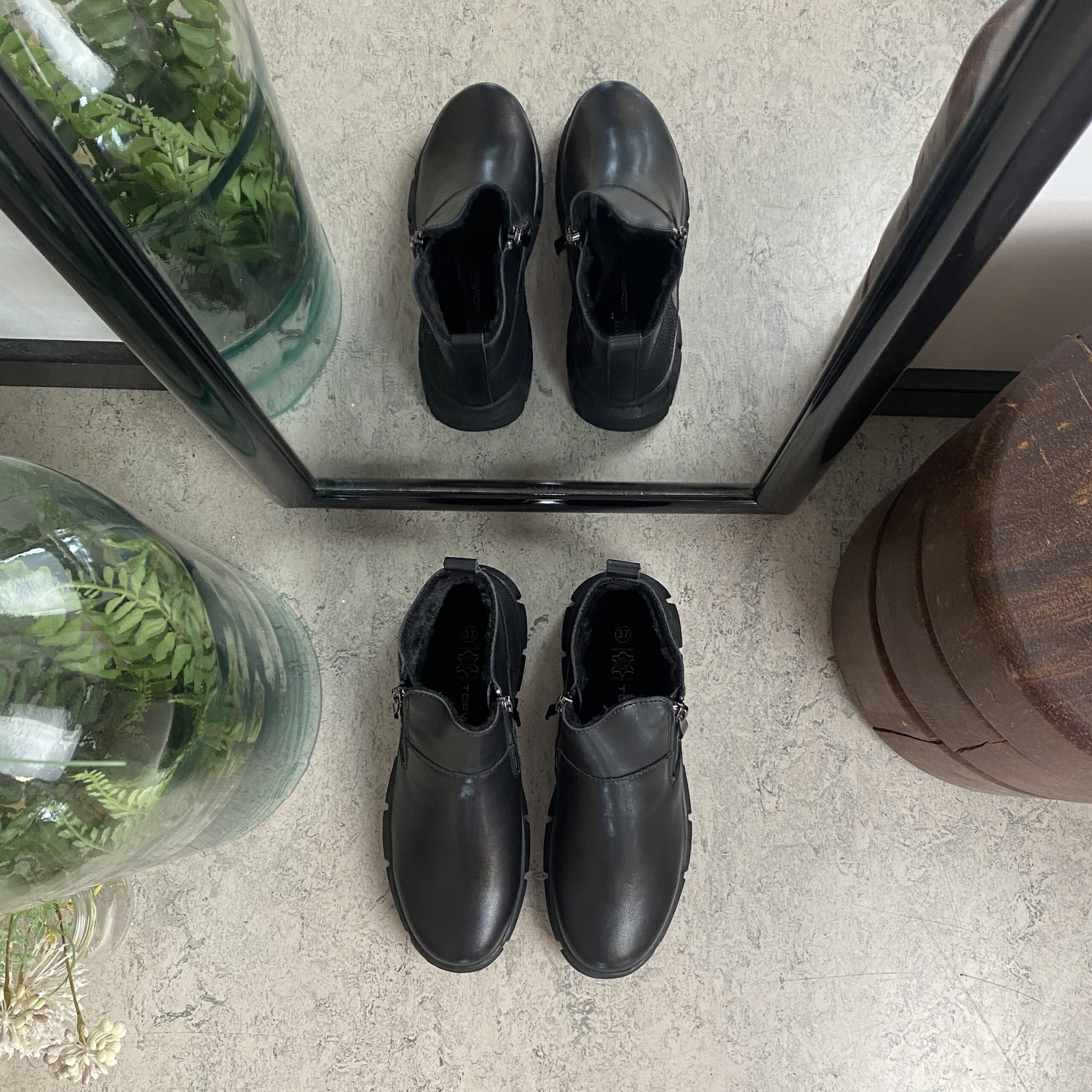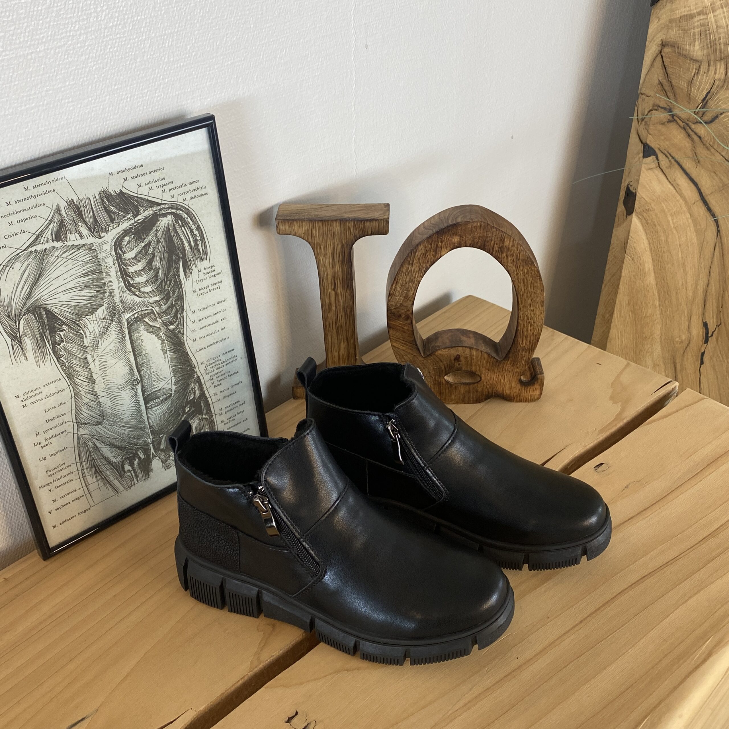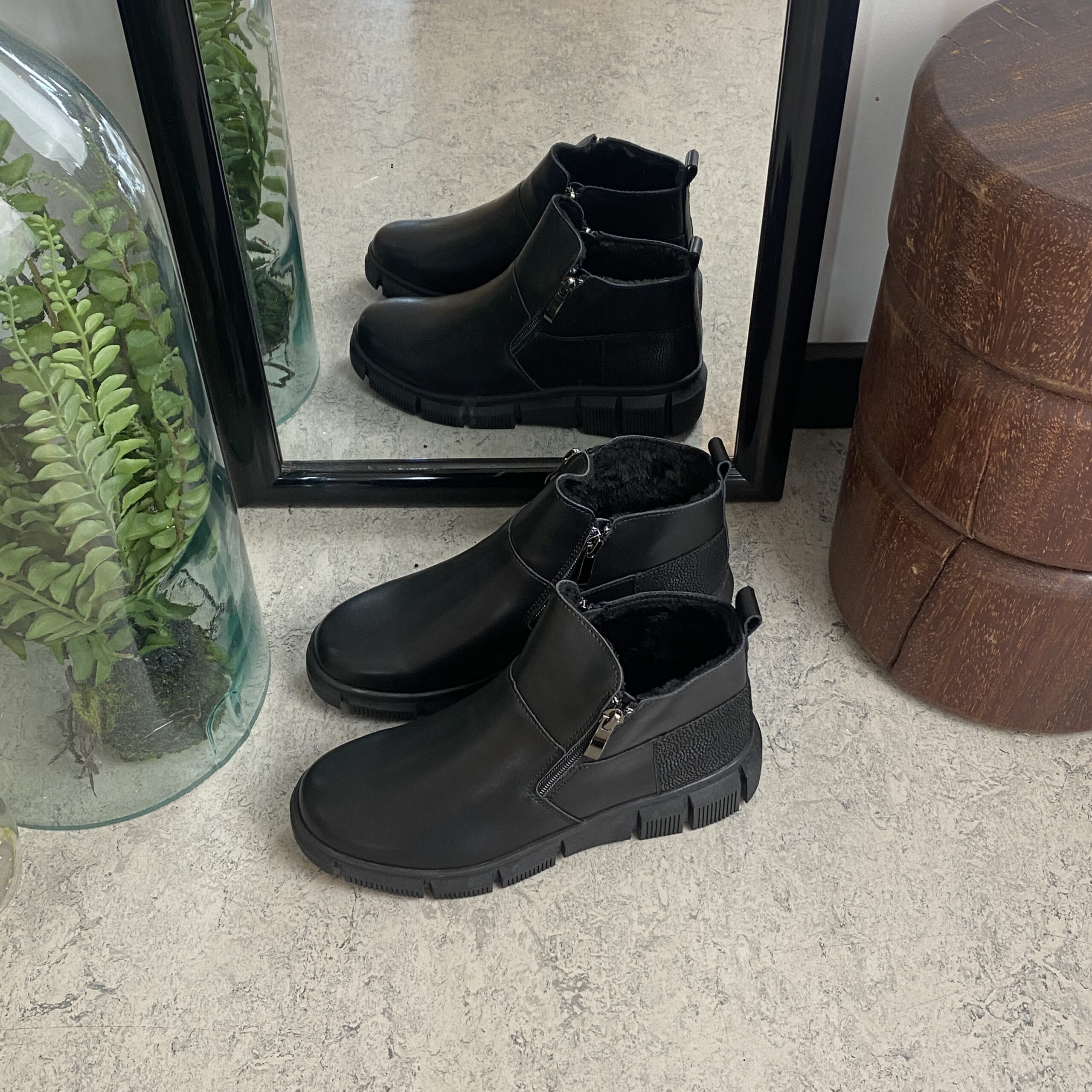 Den här svarta ankelstöveln kombinerar klassisk design med praktiska detaljer. Stöveln är fodrad med mjukt och varmt foder, som säkerställer komfort under de kalla månaderna.